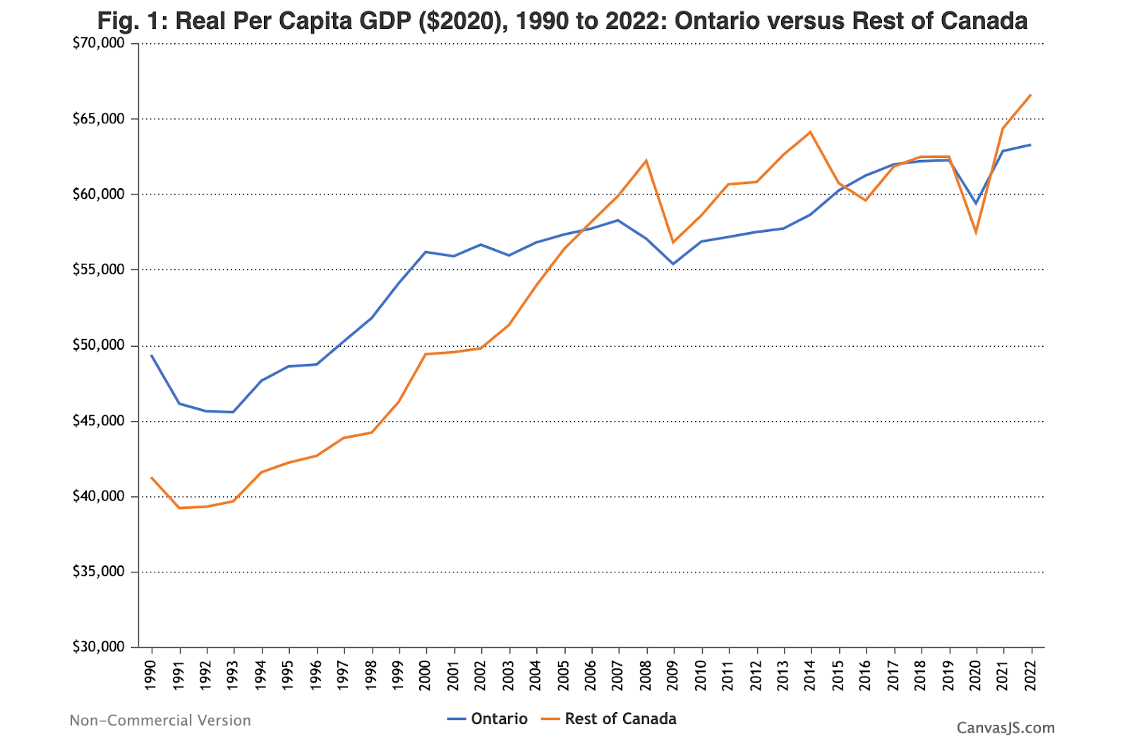 Ontario continues a decades-long economic malaise. From time-to-time economic analysts arise to point out the decline only for the news to be treated as so much water off a duck’s back. Indeed, the complete picture as measured by real per-capita GDP has evolved to the point where the response should be alarm rather than concern.