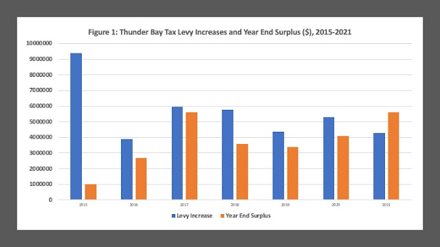 Thunder Bay has been raising taxes consistently more than it has needed to for some time now and that money comes out of the pockets of its residents. During the pandemic, while other cities were trying to keep tax increases at zero, Thunder Bay managed an increase of 2.7 percent in 2020 and 2.1 percent in 2021. Accompanied by generous provincial and federal COVID-19 support, the result has been large and growing surpluses.