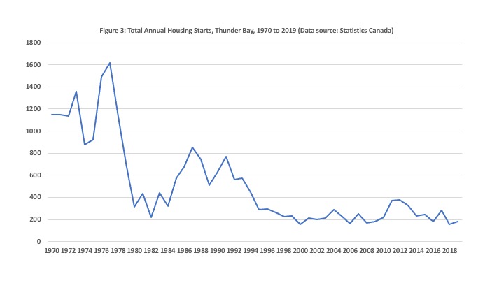 Figure 1 shows that the decline in homicide rates in Thunder Bay that had been occurring in tandem with the rest of the country came to an end circa 2007 – perhaps not entirely coincidentally at the tail end of the massive economic shakeup of the regional forest sector crisis. They have since been rising and Thunder Bay invariably emerges year after year as the murder capital of the country. Figure 2 shows that over the last decade, overall building permit values – which signal new investment – have trended downwards and residential permit values have been largely stagnant. Figure 3 shows that housing starts have essentially been flat at low levels compared to the pre-1990 period. Figure 4 shows that over the last 20 years, employment has trended downward with the pandemic providing the expected additional downward spike at the end of the series.